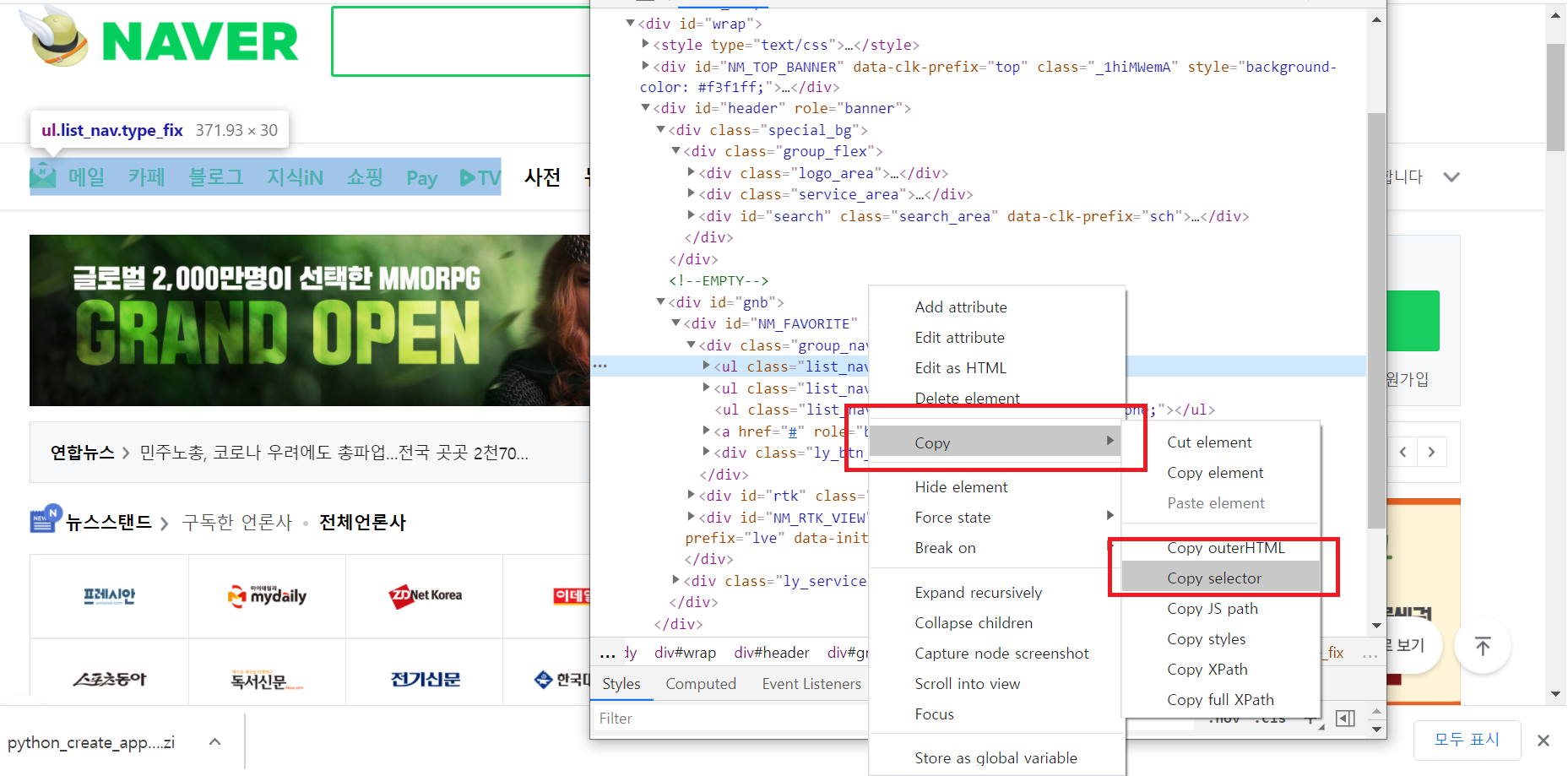 위의 화면은 크롬에서 네이버를 실행하여 f12(개발자도구)를 누르고 elements 에서 네이버 헤더에 포함되어 있는 일부를 Copy selector를 통해 복사한 것이다.