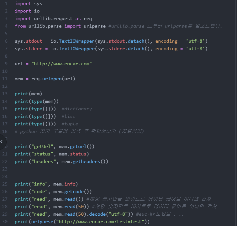 13 : <http.client.HTTPResponse object at 0x000002C0D4311198> 라는 결과가 나오는데 urlopen 한 결과가 어떠한 메모리 공간에 저장되었음을 뜻한다.