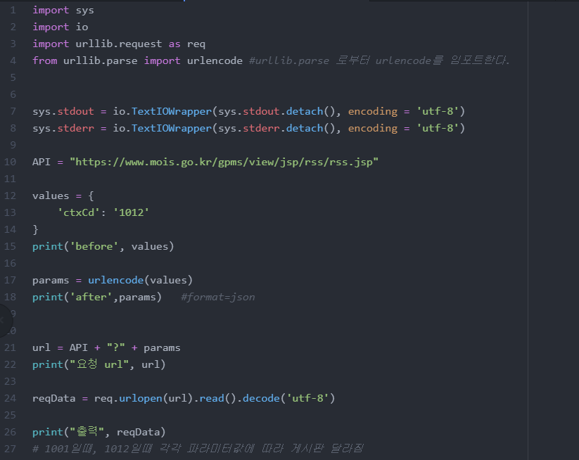 17 : urllib의 parse 메서드로부터 임포트한 urlencode에 values 값을 넣어 형식을 format=json으로 맞춘다