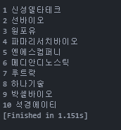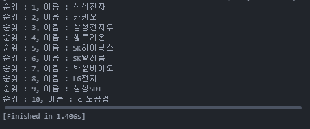 top10을 for문을 통해 a태그의 string값만 출력해보면 아래와 같이 검색 순위 리스트를 확인할 수 있다.