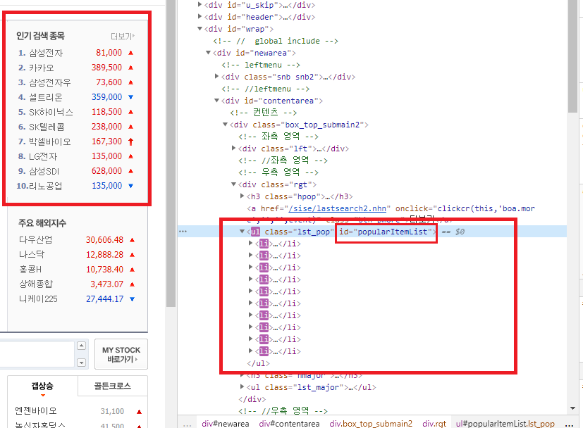 BeautifulSoup을 사용하여 네이버 금융( finance.naver.com/sise/ ) 인기종목 top10, 상한가종목 top10을 가져와보겠다.