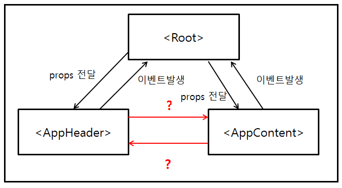 <AppHeader> -> (이벤트발생) -> <Root> -> (props전달) -> <AppContent>