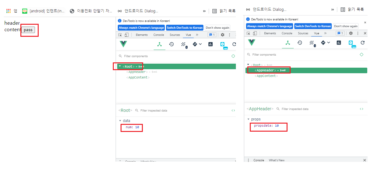 appHeader의 props로 Root의 data 값(10)이 바인딩 된 결과를 확인할 수 있다.