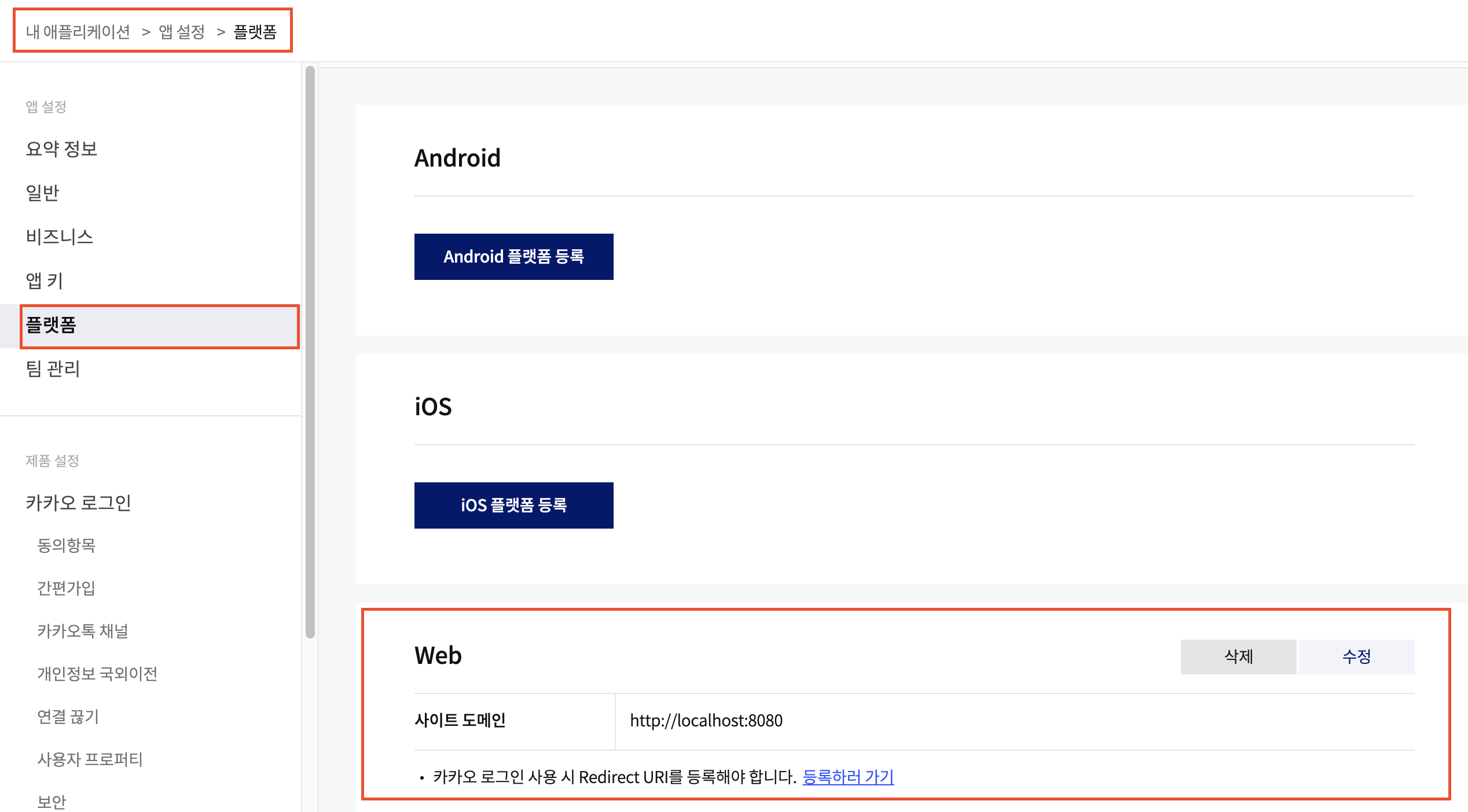 내 애플리케이션 > 앱 설정 > 플랫폼 에서 플랫폼을 등록한다. 내 경우엔 web 으로 실행할 예정이라 web 플랫폼을 등록했고, 로컬에서 실행하므로 http://localhost:8080으로 등록했다.