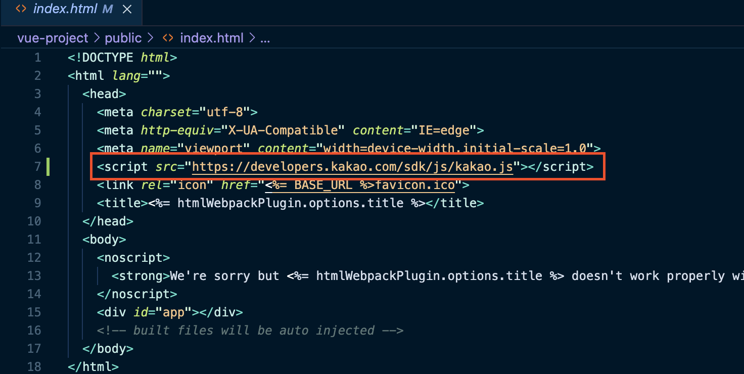 index.html 내에 아래 카카오에서 제공하는 Javascript SDK를 등록한다.