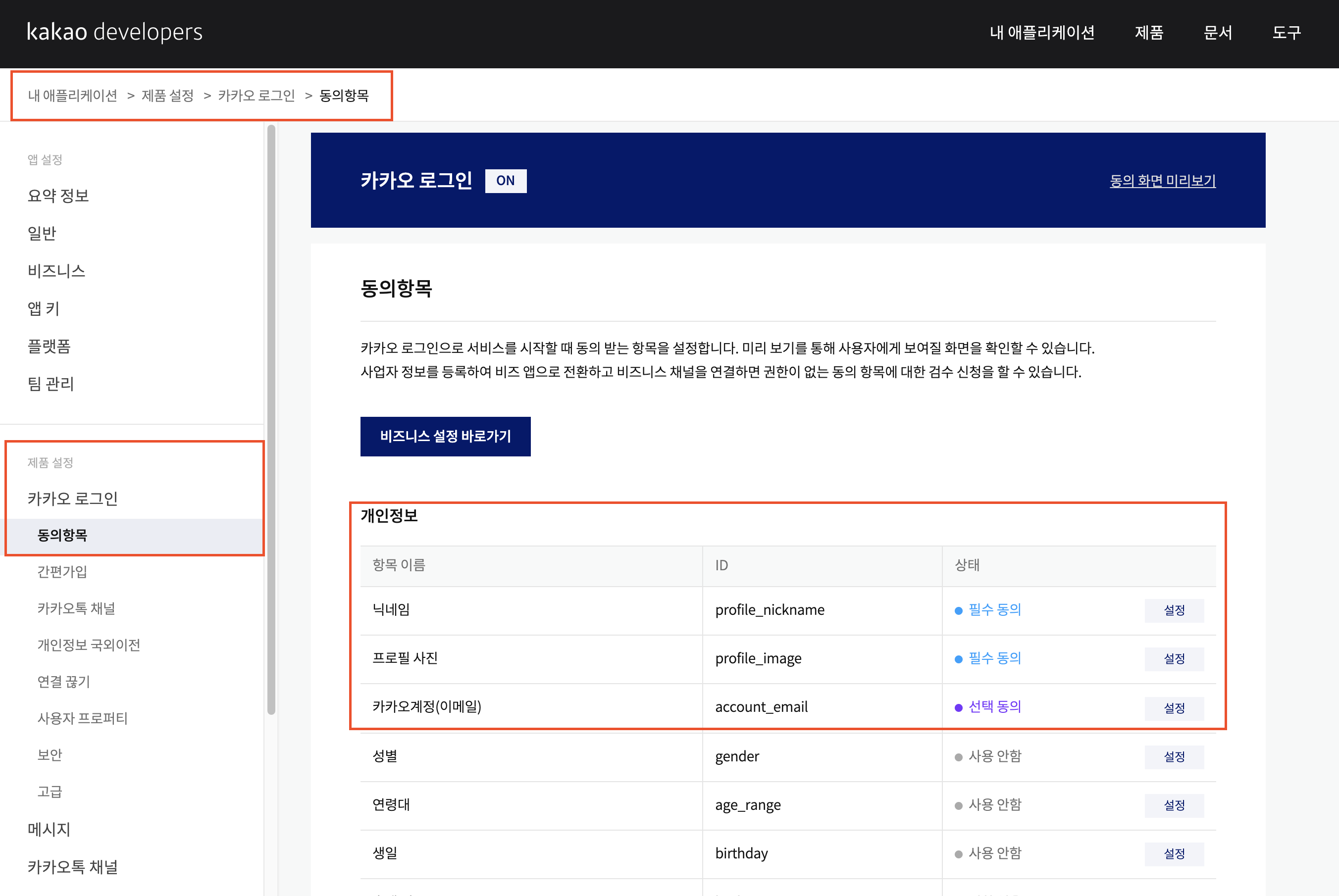 kakao developers 내에서 앱키를 발급받고 내 애플리케이션 > 제품 설정 > 카카오 로그인 > 동의항목 에서 로그인한 사용자에게 제공받을 정보에 대해 동의 체크를 한다.