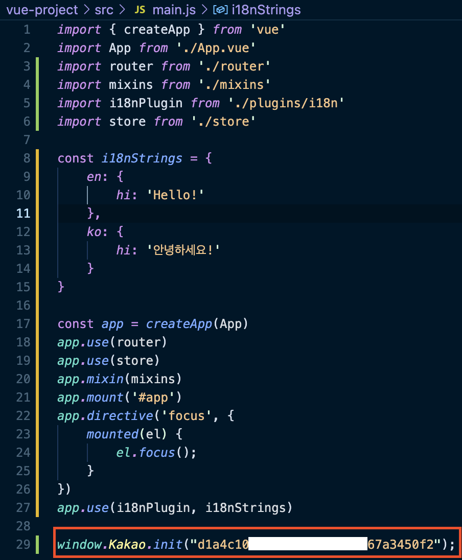 main.js 파일 내 아래와 같이 카카오에서 발급받은 앱키를 입력해준다.