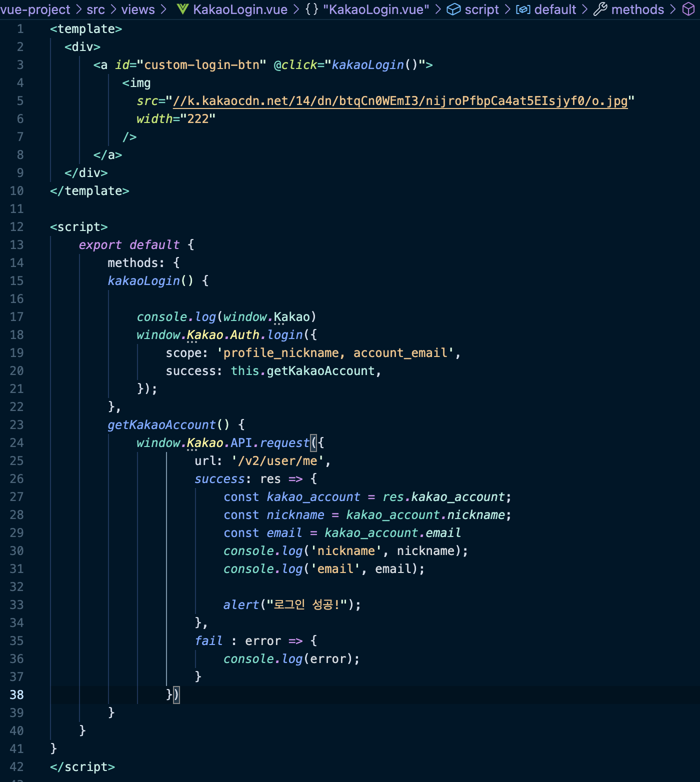 위와같이 vue 코드 작성 후 router를 통해 링크 등록해준다. (나는 /kakaologin 으로 설정)